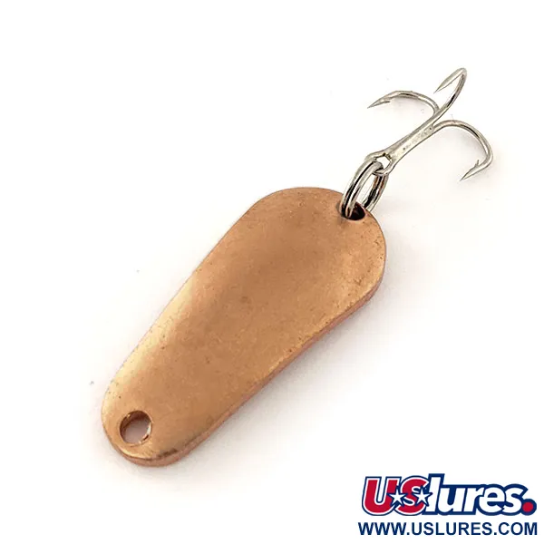Tiesiogiai įgaubtame metaliniame paviršiuje įspaustas „Aero“ pavadinimas ir 1/4 oz (7 g) svorio žyma išskiria šią vintažinę amerikietišką blizgę. Korpusas yra 1 1/2 colio (3,7 cm) ilgio, pasižymi sodria vario apdaila, kuri išlieka ryški ir šviesi, o tai atitinka 5/5 būklės įvertinimą. Pagamintas „Aeroplane Spinner Co.“ JAV, masalas turi tvirtą sidabrinio atspalvio trišakį kabliuką, pritvirtintą žiedeliu gale. Tiksliai išmušta skylutė siaurajame gale leidžia tiesiogiai rišti valą arba pridėti pavadėlį. Atpažįstama pagal prekės kodą 12052, tvirta blizgės konstrukcija yra pritaikyta tradicinei spiningavimo ar velkiavimo technikai.
