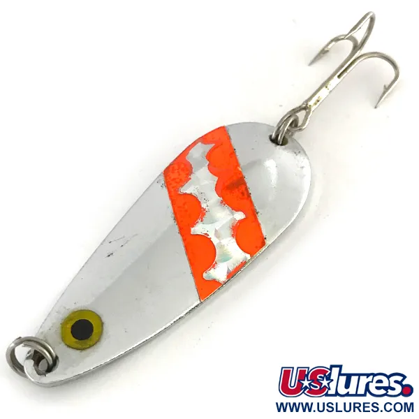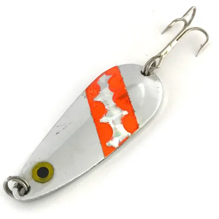 6 cm ilgio ši Moriyama vartiklė demonstruoja meistriškumą, būdingą vidurio amžiaus Japonijos žvejybos įrankiams. Poliruota nikelio / raudona apdaila yra itin pastebima, su plačia įstriža raudonai oranžine juosta, kuri įrėmina unikalų, raukšlėtą sidabrinį įdėklą, skirtą atspindėti šviesą. Priekinėje dalyje, šalia tvirtinimo kilpos, yra ryški geltonai juoda akis. Ši vartiklė, pažymėta produkto kodu 8278, sveria 16 g, todėl ji puikiai tinka tiek spiningavimui, tiek velkiavimui. Kitoje masalo pusėje įgaubtame nikelio paviršiuje įspaustas gamintojo ženklas „Moriyama Japan“. Furnitūra, įskaitant trišakį kabliuką ir žiedelius, yra puikios būklės, įvertinta 5/5 už išlaikytą kokybę.