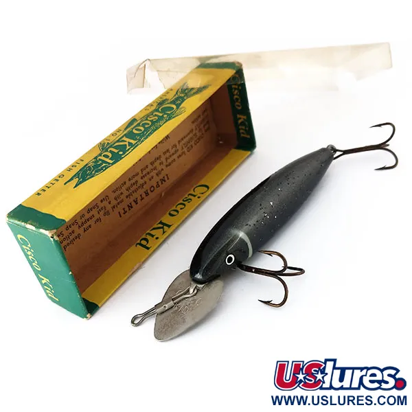 Šis 14 g (1/2 oz) svorio vintažinis modelis pasižymi giliai nardančiu profiliu ir padidintu, reguliuojamu metaliniu liežuvėliu. Bendras 9,5 cm ilgis paverčia Wallsten Tackle Cisco Kid rimtu pasirinkimu sunkiasvorei lydekų ir maskinongų žūklei. Šis masalas, pažymėtas produkto kodu 10173, yra gilios juodos spalvos su sidabriniais taškeliais ir išskirtine balta juosta aplink kaklą. Šis egzempliorius yra nenaudotas ir išsaugotas originalioje geltonai žalioje dėžutėje su skaidriu plastikiniu dangteliu. Reguliuojamas metalinis liežuvėlis yra Cisco Kid linijos vizitinė kortelė, leidžianti žvejui pačiam suderinti masalą norimam gyliui pasiekti, atsižvelgiant į vandens sąlygas. Remiantis vintažinėmis instrukcijomis ant pakuotės, šie rankiniai nustatymai leidžia tiksliai kontroliuoti gylį velkiaujant ar spiningaujant. Dažytos akys (baltos su juodais vyzdžiais) ryškiai išsiskiria tamsiame, taškuotame korpuse.