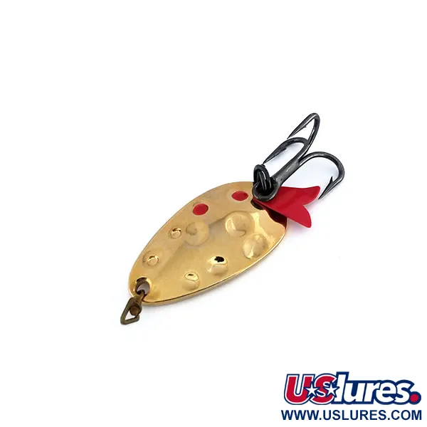 Ši 5 g (3/16 oz) svorio vintažinė vartiklė pasižymi klasikiniu kaltu paviršiumi ant lašo formos korpuso. Auksinis, duobėtas paviršius papuoštas trimis ryškiais raudonais taškais ties viršutine dalimi – tai firminis Acme Fish Hawk serijos ženklas. Šis retas egzempliorius su produkto kodu 9923 nebėra gaminamas, todėl tai vertingas radinys besidomintiems JAV gamybos žūklės įrankių istorija. Masalas apginkluotas tamsintos apdailos trišakiu kabliuku ir firminiu raudonu plastikiniu uodegėlės priedu. Vartiklės ilgis – 3 cm (1 1/4"), o nugarėlė nupoliruota iki lygaus, veidrodinio spindesio. 5/5 būklės įvertinimas atspindi išskirtinį metalinių paviršių ir originalios furnitūros išsaugojimą. Mažas žalvario atspalvio trikampis žiedelis galvutėje užtikrina tvirtą jungtį metimui.