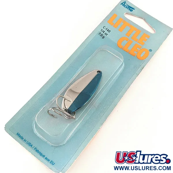 Ši JAV pagaminta blizgė, kurios išlenktas metalinis korpusas yra 4 cm (1 1/2") ilgio, pasižymi tradiciniu dviejų spalvų dizainu, užtikrinančiu didelį vizualinį kontrastą. Nikelio ir mėlynos spalvos danga padengta išskirtinė išgaubta forma, būdinga Acme Little Cleo serijai. Masalas, registruotas prekės kodu 11346 (gamintojo stilius C-140/NNB), yra originalioje lizdinėje pakuotėje. Šio egzemplioriaus būklė yra 6, o tai reiškia, kad jis nenaudotas ir išlaikęs gamyklinį blizgesį tiek ant dangos, tiek ant trišakio kabliuko. 7 g (1/4 oz) svorio blizgė sukurta tiksliems metimams, o jos priekinėje dalyje yra klasikinė įspausta emblema. Pakuotės nugarėlėje esantis dvikalbis tekstas atspindi istorinį masalo populiarumą tarp Šiaurės Amerikos žvejų, trunkantį daugiau nei penkis dešimtmečius.