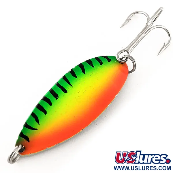 Išraiškingai įspausti poliruoto sidabro nugarėlėje užrašai „LITTLE CLEO“ ir „3/4 OZ.“ (21 g) patvirtina šios amerikietiškos klasikos autentiškumą. Šis 6,5 cm (2 1/2") ilgio egzempliorius pasižymi ryškiu „Fire Tiger“ spalvinimu su juodais dryžiais žaliame, geltoname ir oranžiniame fone. Storų metalinių sienelių konstrukcija ir unikali išgaubta forma yra „Acme Tackle Company“ dizaino vizitinė kortelė, padedanti masalui išlaikyti stabilią poziciją vandens sluoksnyje tolygiai traukiant. Šis konkretus modelis, pažymėtas produkto kodu 11849, yra 5/5 būklės, turi švarų paviršių ir aštrų trišakį kabliuką, pritvirtintą tvirtu žiedeliu. Sunkus padengimas vidinėje pusėje sukuria ryškų blyksnį, kontrastuojantį su ryškiai dažyta išore. Ši 21 g (3/4 oz) vartiklė skirta tiek spiningavimui, tiek velkiavimui, o jos svorio paskirstymas užtikrina tolimus metimus net pučiant priešiniam vėjui.
