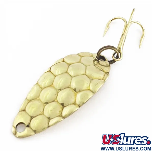 Kaltas šios auksuotos vartiklės paviršius sukuria savitą „burbulų“ tekstūrą, skirtą pagauti ir išsklaidyti šviesą visomis kryptimis. Sveriantis 1/8 oz (3,5 g), kompaktiškas 1 1/4 colio (3 cm) kūnas pasižymi profiliu, imituojančiu smulkias žuveles. Aukso danga išlieka itin švari ant banguoto paviršiaus, o tai rodo gamyklinės apdailos kokybę. Klasikinis lašo formos siluetas turi ryškų galinį išlenkimą, suteikiantį metalui pakankamai masės efektyviam darbui vandenyje. Šis egzempliorius vertinamas 5/5 dėl puikiai išlaikytos išorės. Gaminys, kurio kodas 24558, išsiskiria tolygiu įdubimų raštu išgaubtoje pusėje.