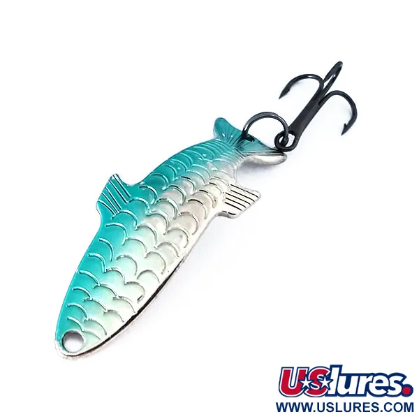 Ši 4 g (1/8 oz) sverianti blizgė pasižymi detaliu žvynų raštu su gradientu, pereinančiu iš sodrios melsvai žalios spalvos palei nugarėlę į blizgią nikelio dangą. Ši JAV pagaminta Acme Phoebe, kurios prekės kodas 10352, yra 4 cm (1 1/2") ilgio ir pasižymi išskirtiniu žuvies siluetu su įspaustais žiaunų dangteliais bei pelekais, suteikiančiais trimatį profilį. Kita pusė yra poliruoto nikelio, ant jos aiškiai įspausti Acme prekės ženklo ir Phoebe modelio pavadinimai. Su originaliais tamsios dangos trišakiais kabliukais ir tvirtu žiedeliu, furnitūra yra puikios būklės. Įvertintas 6 balais, masalas yra nenaudotas ir spindi taip pat, kaip ką tik iš gamyklos. Speciali hidrodinaminė forma sukurta universalumui, leidžiančiam efektyviai žvejoti įvairiuose vandens sluoksniuose.