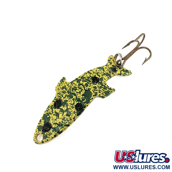 Šį lenktą metalinį masalo korpusą puošia išskirtinis „Frog“ raštas, sudarytas iš žalių ir geltonų purslų, paryškintų ryškiomis juodomis dėmėmis. 1/8 oz (4 g) svorio ir 1 1/2" (4 cm) ilgio masalas pasižymi būdingu anatominiu siluetu, dėl kurio „Acme Phoebe“ dešimtmečius yra žvejų dėžučių favoritas. Šis konkretus gaminys, pažymėtas prekės kodu 11506, yra nenaudotas ir išlaikęs originalią apdailą. Švarioje, sidabrinio atspalvio kitoje pusėje, netoli centro, metale aiškiai įspaustas pavadinimas „PHOEBE“. Masalas apginkluotas aštriu, bronzos spalvos trišakiu kabliuku, pritvirtintu patikimu žiedeliu uodegos dalyje. Dėl trimačio štampuoto dizaino jis atrodo kaip tikroviškas žuvelės profilis žvelgiant iš įvairių kampų tiek metant, tiek velkiaujant.
