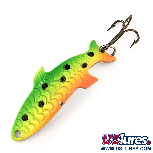 Fluorescenciniai Fire Tiger dažai dengia šią 4cm (1 1/2") žuvies formos blisgę, pereinančią nuo ryškios laimo žalumo nugarėlės iki šilto oranžinio pilvelio. Šis masalas, kurio prekės kodas 11488, sveria 4g (1/8 oz) ir yra nenaudotas, atrodantis lygiai taip pat, kaip išvykęs iš „Acme“ dirbtuvių JAV. Štampuotas metalinis korpusas pasižymi detaliais reljefiniais žvynais ir pelekais, sukuriančiais tikrovišką trimatį siluetą. Viena išskirtiniausių šio modelio savybių yra UV aktyvi danga; veikiant UV šviesai, korpusas stipriai švyti, užtikrindamas puikų matomumą prasto apšvietimo sąlygomis. Masalas komplektuojamas su aštriu trišakiu kabliu, pritvirtintu patikimu žiedeliu prie žuvies formos profilio uodegos.