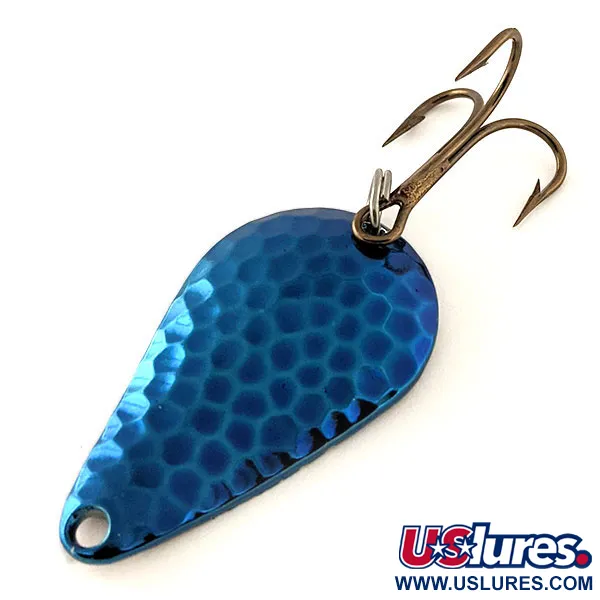 Kalta mėlyna apdaila dengia šios 1/2oz (14g) blizgės priekinę dalį, sukurdama tekstūruotą paviršių, kuris po vandeniu atspindi šviesą. Kitoje pusėje yra poliruoto nikelio paviršius su įspaustu klasikiniu Stee-Lee pavadinimu. Šis Acme modelis, žymimas prekės kodu 12075, yra 4,5 cm (1 3/4") ilgio ir nenaudotas. Pagaminta JAV, turi tvirtą bronzinį trišakį kabliuką ir stiprų žiedelį uodegoje. Lašo formos profilis subalansuotas tolimiems metimams, todėl tai patikimas pasirinkimas žvejojant nuo kranto arba siekiant gilesnius vandens sluoksnius iš valties. Viršūnėlėje yra tiksliai išmušta skylutė, paruošta tiesioginiam rišimui arba suktukui.