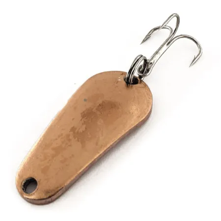 Šilta vario apdaila apibūdina šią klasikinę amerikietišką blizgę, atspindinčią šviesą su švelniu švytėjimu, būdingu senoviniams metaliniams masalams. Pagamintas „Aeroplane Spinner“ kompanijos JAV, šis Aero modelis (prekės kodas: 11796) reprezentuoja paprastos ir efektyvios žūklės įrangos dizaino laikotarpį. Sverianti 7 g (1/4 oz) ir 3,7 cm (1 1/2") ilgio, jos lašo formos profilis yra išspaustas su subtiliu išlenkimu darbui vandenyje. Šis egzempliorius yra nenaudotas, 5/5 būklės, paviršius švarus ir be nusidėvėjimo žymių. Blizgė turi sidabro spalvos žiedelį ir aštrų trišakį kabliuką, kurie puikiai kontrastuoja su sodriu, raudonai auksinio atspalvio variniu korpusu.