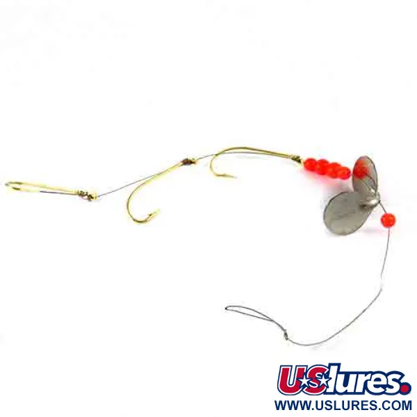 Aukso spalvos kabliukai kartu su ryškiai raudonais karoliukais apibūdina šios klasikinės amerikietiškos sistemos vizualinį profilį. Bendras sistemos ilgis yra 7 3/4" (20 cm), o ją sudaro nikeliuota dviejų menčių propelerinė sukrė, ant kurios paviršiaus aiškiai išspausta „3 AERO SPIN“. Sverianti lengvą 1/8 oz (4 g), ši įranga sumontuota ant lankstaus vielinio pavadėlio, dažnai naudojamo velkiavimui arba spiningavimui. „Aeroplane Spinner“ kompanija naudojo specifinį „Aero spin 3“ dizainą, kuriame yra šešių ryškiai raudonų karoliukų serija, sukurta vizualiniam kontrastui su metaliniu nikeliuotu menčių paviršiumi. Šis egzempliorius, pažymėtas prekės kodu 2992, yra įspūdingos būklės, įvertintas 5/5 dėl gerai prižiūrėtų paviršių ir aštrių kabliukų. Aukso spalvos kabliukai strategiškai išdėstyti išilgai valo, kad tiktų įvairiems masalo tvirtinimo būdams.