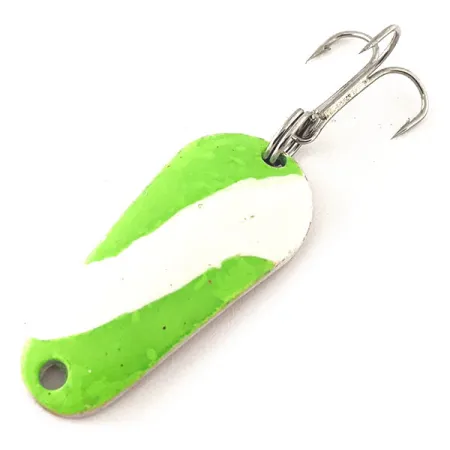 Po ryškiu žaliu ir baltu fluorescenciniu viršutiniu sluoksniu slepiasi varinis pagrindas – tai JAV pagaminta vartiklė. 3,7 cm (1 1/2") ilgio masalas sukurtas užtikrinti puikų matomumą, ypač todėl, kad dažai stipriai reaguoja į UV šviesą. Šis Aeroplane Spinner modelis, žymimas prekės kodu 12054, sveria 7 g (1/4oz), todėl yra pakankamai sunkus tiksliam pateikimui vandens sluoksnyje. Apdaila yra puikios būklės (5/5), banguotas raštas išliko ryškus ir nepažeistas. Vienas žiedelis jungia aštrų trišakį kabliuką prie blizgės galo. Smailėjantis profilis užtikrina stabilų skendimą džigaujant arba ritmingą blyksėjimą traukiant masalą per vandenį.