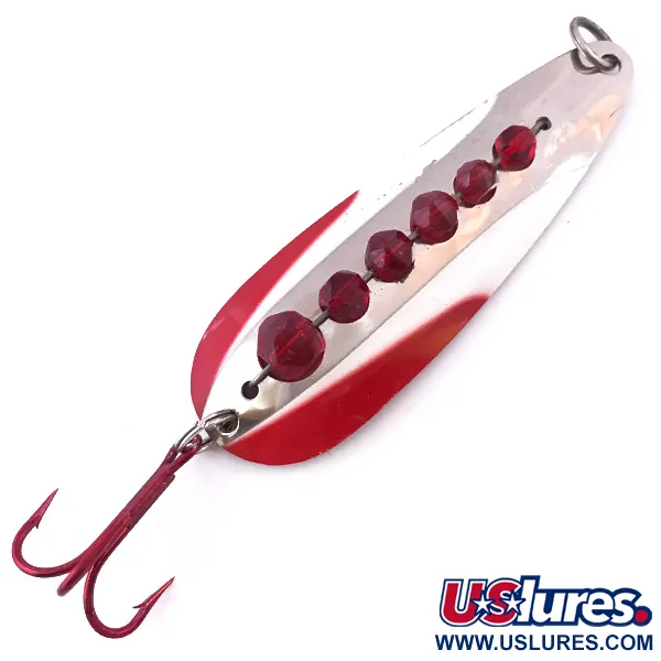 Šeši briaunoti raudono stiklo kristalai tiksliai įmontuoti palei šios sunkios nikelio blizgės nugarėlę, gaudantys šviesą keliais kampais ir imituojantys masalinės žuvies blyksnius. Sverdama solidžius 28 g (1 oz), AL&W Toronto Jeweled Watertek yra 8,5 cm (3 1/4") ilgio, todėl tai yra puikus pasirinkimas spiningavimui ar velkiavimui gilesniuose vandenyse. Pagaminta Kanados gamintojo AL&W Tackle, ši 4002 modelio blizgė pasižymi klasikinėmis Nikelio / Raudonos spalvomis, o apatinėje pusėje palei kraštus matomas ryškus raudonas akcentas, kontrastuojantis su poliruoto sidabro apdaila. Konstrukcija išlieka tvirta, įskaitant derantį raudoną trišakį kabliuką, kuris papildo bendrą estetiką. Blizgės būklė išlaikyta 4/5, su aiškiais, įskaitomais įspaudais kitoje pusėje. Šie įspaudai apima „CAN PAT REG 1931“ žymėjimą – ankstyvųjų Kanados modelių, jungiančių vizualų patrauklumą ir itin tvirtą konstrukciją, ženklą. Maži žiedeliai galvoje ir uodegoje užtikrina komponentų saugumą, todėl masalas yra paruoštas tiek kolekcijai, tiek didelių plėšrūnų žūklei.