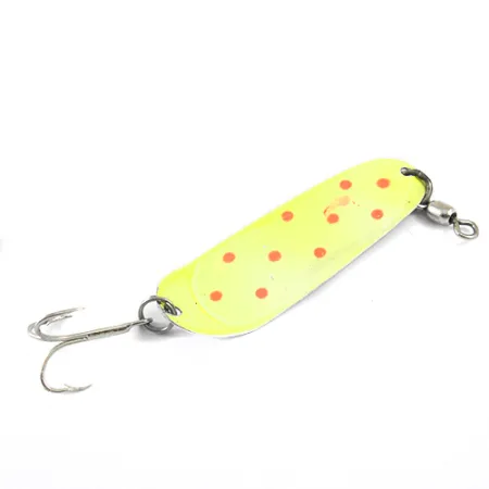 Ši 7,5 cm (3 colių) Andy Reekers blizgė su štampuotu nikelio pagrindu pasižymi klasikinio atspindžio savybėmis, kurios dešimtmečius vertinamos žvejų. Priekinė dalis padengta ryškiai geltonais dažais su ryškiais raudonais taškais – ši spalvų kombinacija pasirinkta dėl puikaus matomumo įvairiomis vandens sąlygomis. 11 g (2/5 oz) svorio masalas yra subalansuotas tiek velčiavimui, tiek spiningavimui. Priekyje sumontuotas tvirtas „bačkutės“ tipo sukutis saugo valą nuo susisukimo, o gale įkabintas klasikinio stiliaus trišakis kablys. Ši JAV pagaminta blizgė (produkto kodas 1286) pasižymi gerai išlaikyta spalva ir minimaliais nusidėvėjimo požymiais (būklė 4/5). Kita pusė yra poliruoto nikelio, todėl dviejų tonų žaismas sukuria stiprų kontrastą su ryškiai geltona viršutine dalimi.