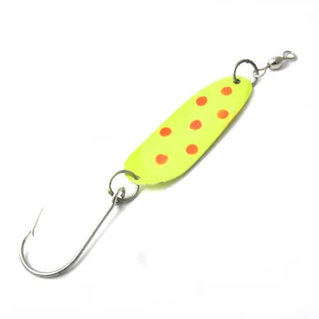 Ištaškuotas raudonais apskritimais ryškiai geltoname fone, „Andy Reekers 3“ atspindi išskirtinį vidurio amžiaus JAV velkiavimo įrangos vizualinį stilių. Šis 4,5 g (3/16 oz) modelis, žymimas prekės kodu 0440, pasižymi paprastu, bet efektyviu profiliu, sukurtu tolygiam judėjimui per vandens sluoksnius. Galinė pusė yra vientisos geltonos spalvos su juodai geltona „taikinio“ akimi šalia priekio, suteikiančia papildomą dėmesio centrą sekančioms žuvims. Blizgė komplektuojama su vienšakiu kabliuku ir priekyje sumontuotu suktuku, kurie yra būtini stabilumui palaikyti ir valo susisukimui išvengti velkiaujant. Eksponatas yra 5/5 būklės, išlaikęs originalią gamyklinę korpuso ir furnitūros apdailą.