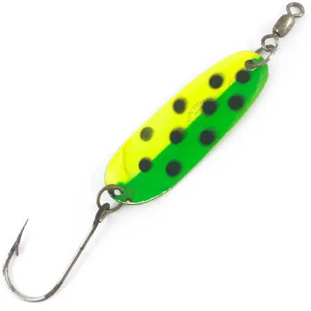 Tiksliai 6 cm ilgio klasikinė blizgė velčiavimui pasižymi ryškia, kontrastinga apdaila, sukurta maksimaliam matomumui. Šis Andy Reekers UV modelis, sveriantis 7 g, išsiskiria vertikaliai padalintu priekiniu paviršiumi tarp ryškiai geltonos ir sodrios žalios spalvos, kurią papildo dideli juodi taškai. Galinė masalo pusė padengta vientisa geltona UV spinduliams jautria danga – tai techninis sprendimas, skirtas velčiavimui giliuose vandenyse, kur šviesos skvarba yra ribota. Paruošta naudoti iškart, blizgė sukomplektuota su dideliu vienšakiu kabliuku ir viršuje sumontuotu suktuku, sujungtais tvirtais žiedeliais. Pagaminta JAV (produkto kodas 4691), nikelio pagrindas užtikrina patvarų pagrindą dažymui. Šis egzempliorius yra puikios 5/5 būklės, paviršius gerai išsilaikęs, kas būdinga aukštos kokybės vintažiniams radiniams. Dažai išlieka ryškūs ant štampuoto metalinio korpuso, o tai yra Reekers dizaino, skirto lašišų ir upėtakių žvejams, vizitinė kortelė.