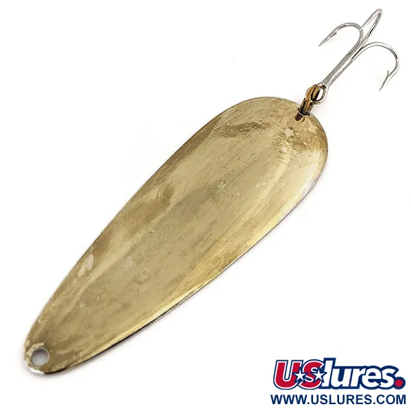 Ši vintažinė metalinė blizgė su gamintojo žyma „NEBCO MPLS. MINN. U.S.A.“ vidinėje pusėje yra ankstyvųjų amerikietiškų blizgių funkcionalaus paprastumo pavyzdys. 9 cm (3 1/2 colio) ilgio Aqua Spoon sveria 21 g (3/4 oz), todėl yra pakankamai sunki metimams į gilius vandenis arba gylio palaikymui lėtai velkiaujant. Auksinė spalva išlieka ryški visame paviršiuje, matomi tik nedideli naudojimo požymiai, todėl jos būklė vertinama 4/5. Vienas didelis trišakis kablys pritvirtintas tvirtu žiedeliu galinėje dalyje, o priekinė tvirtinimo anga yra paprasta, švariai išpjauta siaurame lašo formos gale. Šis pavyzdys, identifikuojamas produkto kodu 12755, pasižymi lygiu, poliruotu paviršiumi, sukurtu maksimaliam blizgesiui įvairiomis apšvietimo sąlygomis.