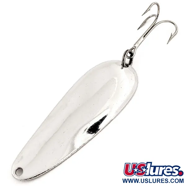 Tiksliai 1/2 oz (14 g) sverianti ši klasikinė Amerikos žūklės įrankių istorijos dalis pasižymi ryškia nikelio apdaila, kuri išlieka stebėtinai skaidri. Lašo formos korpusas yra 2 3/4" (7 cm) ilgio, jame išlikusi originali gamyklinė furnitūra, įskaitant tvirtą žiedelį ir aštrų trišakį kabliuką gale. Įgaubtoje pusėje ant Aqua Spoon aiškiai išspaustas pavadinimas ir užrašas „MADE IN U.S.A.“ – ši detalė dažnai vertinama kolekcininkų, tyrinėjančių praėjusio amžiaos vidurio Nebco produkciją. Šis egzempliorius, pažymėtas prekės kodu 12969, yra 5/5 būklės, pasižymi stipriai atspindinčiu paviršiumi ir švariais kraštais. Paprastas, funkcionalus šios blizgės dizainas pabrėžia tiesmukiškus to meto gamybos standartus.