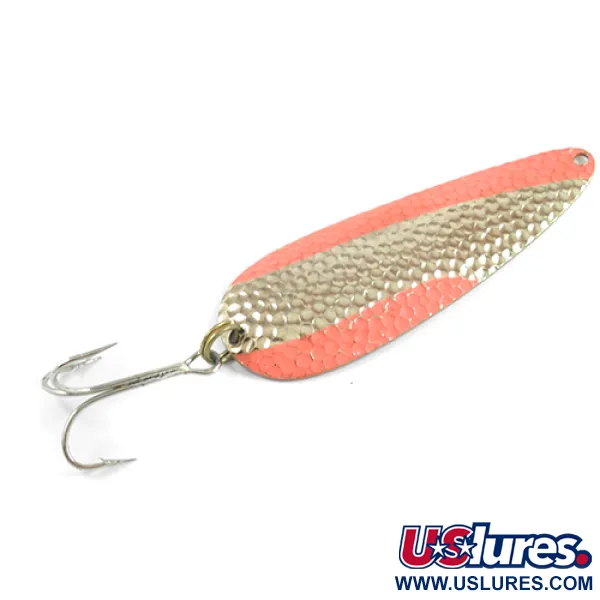 Kalto aukso ir ryškiai oranžinės spalvos apdaila sukuria ryškų vizualinį kontrastą šio masalo paviršiuje, kuris kataloge žymimas kodu 2452. 21 g (3/4 oz) svorio ir 9 cm (3 1/2") ilgio blinkė pasižymi giliai kalta tekstūra, sukurta gaudyti ir atspindėti šviesą visame paviršiuje. Kitoje pusėje matoma lygi, poliruota auksinė apdaila su aiškiu įspaudu „AQUA SPOON MADE IN USA“, pabrėžiančiu „Nebco“ gamybos kilmę. Masalas yra 5/5 būklės, pasižymi švariu metalo blizgesiu ir puikiai išlikusiais dažais pakraščiuose. Tvirtas trišakis kablys patikimai pritvirtintas per stiprų žalvarinį žiedelį uodegoje, o priekinė dalis yra paruošta tiesioginiam valo tvirtinimui. Skirta tradiciniam spiningavimui ar velkiavimui, ši lašo formos ir didelio svorio blinkė užtikrina reikiamą tankį tolimiems metimams ir gylio valdymui atvirame vandenyje.
