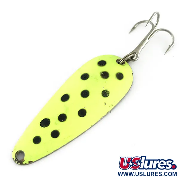 Ant šios 9 g (1/3 oz) metalinės blizgės bronzinės nugarėlės aiškiai išspaustos klasikinės Blue Fox žymos ir kilmės šalis „USA“. 5,5 cm (2 1/4") ilgio Aqua Spoon turi produkto kodą 9525 ir pasižymi ryškiai matoma šartrezo spalvos priekine dalimi su trylika juodų taškų. Masalo būklė įvertinta 4/5 – matomi nedideli naudojimo požymiai (lengvas dažų nusitrynimas kraštuose), tačiau metalinis pagrindas ir įspaustos raidės išliko ryškūs. Konstrukciją sudaro tvirtas trišakis kabliukas, pritvirtintas žiedeliu, todėl tai patikimas pasirinkimas spiningavimui ar velkiavimui įvairiomis apšvietimo sąlygomis. Kontrastas tarp neoninio paviršiaus ir žalvarinės apačios yra būdingas prekės ženklo JAV gamybos laikotarpio dizainas. Prie tvirtinimo kilpos išspaustas nedidelis lapės galvos logotipas suteikia papildomo autentiškumo vintažinės žūklės įrangos kolekcionieriams.