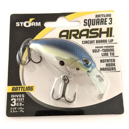 Melsvos nugarėlės žuvelės tonai su subtiliu perlamutriniu žvynų raštu ir melsvai žalsva gerkle apibūdina šio Storm Arashi Rattling Square 3 estetiką. Šis 1/2 oz (14 g) modelis, kurio prekės kodas 11952, yra 2 1/4" (5,5 cm) ilgio ir sukonstruotas pasiekti 3 pėdų (0,9 m) nardymo gylį. Konstrukcijoje naudojama plona tekstolitinė (circuit board) mentelė – savybė, kurią žvejai mėgsta dėl gebėjimo greitai „užsivesti“ net ir prie mažų greičių. Ši konstrukcija taip pat apima patentuojamą savaime išsilyginančią kilpelę valui, kuri užtikrina, kad masalas traukiamas eitų tiesiai be rankinio reguliavimo. Pasukti kabliukų laikikliai yra svarbi detalė, priglaudžianti trišakius arčiau kūno, kad sumažėtų kliuvinių tikimybė, kartu leidžiant naudoti didesnius kabliukus. Šis konkretus masalas yra nenaudotas, jo būklės įvertinimas – 6. Kūno viduje esanti barškėjimo kamera suteikia garsinį efektą vandenyje. Originalioje pakuotėje nurodyta, kad šis modelis buvo pagamintas Indonezijoje Rapala VMC Corp. užsakymu.