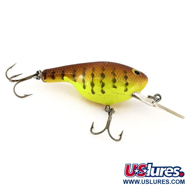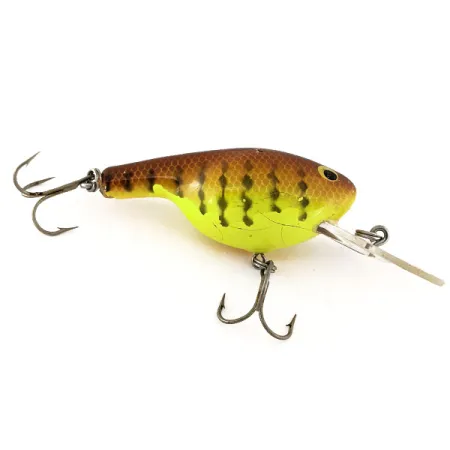 Fire Tiger raštai, kaip ir ant šio 14 g (1/2oz) egzemplioriaus, yra legendiniai dėl savo didelio kontrasto drumstame vandenyje. Šis Bagley Mama CAT, atpažįstamas pagal produkto kodą 11354, reprezentuoja klasikinį amerikietišką medinių masalų meistriškumą iš JAV. 7 cm (2 3/4") ilgio korpusas pasižymi šiltu pereinamuoju rudos-geltonos spalvos tonu, kurį pabrėžia tamsūs vertikalūs dryžiai ir subtilus žvynų raštas išilgai nugaros. Didelis skaidraus plastiko liežuvėlis skirtas giluminiam vedimui, jis tvirtai įtvirtintas mediniame korpuse kartu su dviem tvirtais trišakiais kabliukais. Būklė vertinama 3/5; paviršius rodo senėjimo požymius – smulkius įtrūkimus ant geltonų šonų, kas būdinga vintažiniams balsos ir medžio masalams. Didelės geltonos akys su ryškiais juodais vyzdžiais išliko skaidrios, suteikdamos tą firminę išvaizdą, kurios kolekcininkai ieško autentiškuose Bagley kūriniuose. Kiekviena detalė, nuo metalinių detalių iki specifinių dažų perėjimų, pabrėžia šio giluminio įrankio utilitarų dizainą.