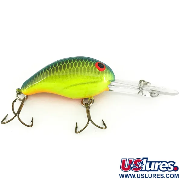 Išsamus žvynelių raštas palei nugarą pereina į ryškią neoninę geltoną šiame Chartreuse Blue Back spalvinime. Sukurtas kaip giliavandenis įrankis, Bandit 300 turi prekės kodą 6813 ir yra sukonstruotas pasiekti 2,4–3,6 m gylį. Šis plūduriuojantis „crankbait“ tipo vobleris sveria 10,5 g ir yra kompaktiško 5 cm ilgio, todėl yra patikimas pasirinkimas tiek spiningaujant, tiek velkiaujant. Vizualinį profilį pabrėžia ryškiai oranžinis pilvas ir ryškios raudonos akys, užtikrinančios ryškų kontrastą tokiems plėšrūnams kaip lydekos ar standartiniai sterkai. Didelis, skaidrus liežuvėlis yra saugiai pritvirtintas prie korpuso, kad atlaikytų pasipriešinimą traukiant giliame vandenyje. Šis konkretus egzempliorius yra 5/5 būklės, išlaikęs švarią apdailą ir aštrius, bronzuotus trišakius kabliukus. Triukšminga vidinė barškėjimo kamera suteikia pristatymui akustinį elementą – tai išskirtinis šio klasikinio JAV gamybos voblerio bruožas.
