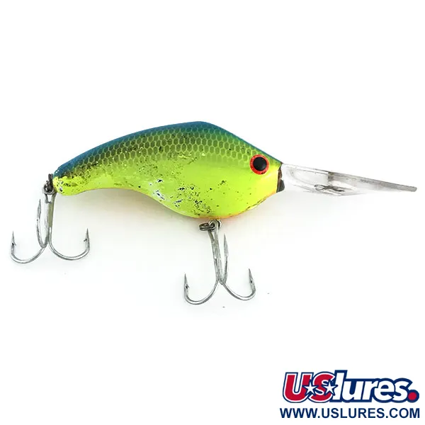 Ultravioletinių spindulių aktyvavimas leidžia 21 g (3/4 oz) korpusui ryškiai švytėti gylyje – tai itin svarbi savybė žvejojant prasto matomumo sąlygomis. Šis 7 cm (2 3/4") ilgio modelis pasižymi ryškiai geltonu pilveliu ir šonais, pereinančiais į mėlynai žalią žvynuotą nugarėlę su ryškiai raudona akimi. Bandit 700 UV (produkto kodas 9021) yra specializuotas giliavandenis vobleris, skirtas pasiekti 4,2–5,4 m (14–18 pėdų) gylį tiek spiningaujant, tiek velkiaujant. Skaidrus, pailgintas liežuvėlis suderintas su vidine barškėjimo kamera – tai JAV gamintojo Bandit Lures sprendimas, skirtas provokuoti sterkų ir lydekų atakas drumstame vandenyje. Matomi nedideli naudojimo žymės, atitinkančios 4/5 būklės įvertinimą, vobleris išlaikęs originalią furnitūrą. Du pilvo srityje sumontuoti trišakiai kabliukai pritvirtinti tvirtais žiedeliais, paruošti naudojimui.