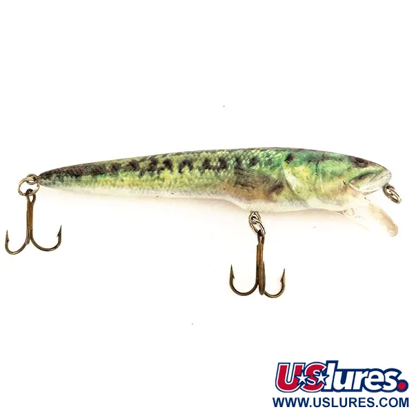 Šis 10 cm (4 colių) bendro ilgio Berkley Frenzy FWD4S yra išskirtinis plaukiantis minnow tipo vobleris iš 9597 gamybos serijos. Masalas sveria 14 g (1/2 oz) ir turi skaidrų, apvalintą liežuvėlį, kuris pasiekia 1,2 m (3,9 pėdų) darbinį gylį. Jo būklė vertinama 5/5, o fotorealistinė „baby bass“ apdaila išlieka ryški ir be nusidėvėjimo žymių. Raštas pasižymi tamsiai žalia nugara, pereinančia į gelsvai žalius šonus, pažymėtus išskirtinėmis tamsiomis jaunojo ešerio šoninėmis dėmėmis. Šio JAV pagaminto masalo komplektacijoje yra originalūs tamsios apdailos trišakiai kabliukai ir tvirtas priekinis žiedelis. Berkley panaudojo šią realistinę estetiką, kad sujungtų tradicinius dažytus masalus ir šiuolaikinę aukštos raiškos apdailą. Tamsių, fiksuotų akių rinkinys suteikia natūralų akcentą šalia voblerio galvos.