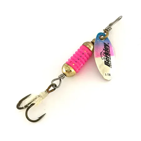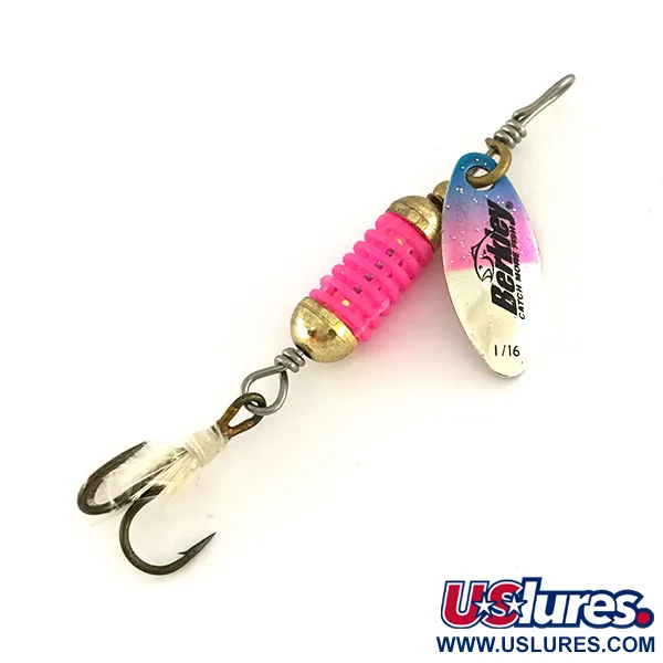 Rožiniai rumbuoti segmentai sudaro centrinę šios Berkley Scent Vent kvapų kamerą – ši konstrukcija specialiai sukurta sulaikyti skystus atraktantus metimo ir traukimo metu. Ši JAV pagaminta sukrutė (produkto kodas 7885) sveria 3/32oz (2,5g), o bendras jos ilgis yra 2 1/4" (5,5cm). Nikeliuotas lapelis viršutinėje dalyje dekoruotas švelniu mėlynos ir rožinės spalvos gradientu, greta senovinio Berkley logotipo. Puoštas trišakis kablys su baltu plunksnos apvadu sukuria subtilų vizualinį profilį po pasunkintu korpusu. Būklė vertinama 5/5: aukso spalvos karoliukai ir vielos apvijos išlieka ryškūs, o rožinė kameros medžiaga atrodo kaip nauja. Ant lapelio matomas 1/16 įspaudas, nurodantis konkretų lapelio dydį šiai 3/32oz (2,5g) konfigūracijai.