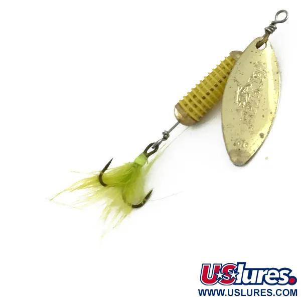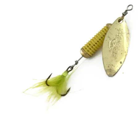 Ryškus aukso atspalvio gluosnio lapo (willow leaf) formos lapelis dominuoja šioje Berkley Scent Vent suktyklėje. 6 cm (2 1/4 colio) ilgio centrinė dalis yra išskirtinis geltonas rumbuotas plastikinis korpusas, specialiai sukurtas tam, kad sulaikytų ir naudojimo metu skleistų žuvų atraktantą. Šis konkretus egzempliorius, pažymėtas produkto kodu 9437, yra 5/5 būklės, pasižymintis gerai išlikusia metaline apdaila ir švaria, nepažeista kvapo skleidimo mova. Konstrukcijoje naudojamas trišakis kabliukas, papuoštas ryškiai geltonomis plunksnomis ir marabu, suteikiantis minkštą vizualinį elementą už pasunkinto korpuso. 4,5 g (3/16 oz) svorio masalas turi tvirtą vielos ašį ir klasikinę viršutinę kilpelę lengvam valo tvirtinimui. Pagaminta JAV, paauksuotas lapelis yra įspaustas su Berkley prekės ženklo logotipu – tai kokybės ženklas kolekcininkams, vertinantiems vidurio amžiaus vintažinę žūklės įrangą.