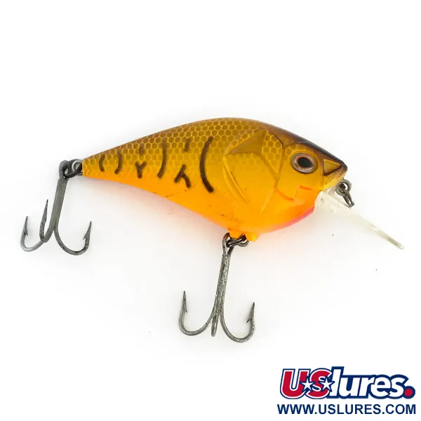 Ryški auksinė-geltona „Tiger“ apdaila išskiria šį 14 g (1/2 oz) „crankbait“ tipo voblerį, kurio nugara papuošta detaliu korio formos žvynelių raštu. „Berkley“ sukūrė „Squarebull“ modelį (produkto kodas 8377), kurio ilgis siekia 7 cm (2 3/4"), specializuotam spiningavimui. Techninė konstrukcija apima skaidrų kvadratinį liežuvėlį, leidžiantį pasiekti nuo 0,9 m (3 pėdų) iki 2,1 m (7 pėdų) nėrimo gylį. Vizualinės detalės yra itin ryškios: tamsiai ruda nugara pereina į ryškiai oranžinį pilvą su raudonu akcentu ties gerkle. Viduje šis barškantis, plaukiantis modelis yra sukonstruotas garso generavimui ir plūdrumui užtikrinti. Originali furnitūra, įskaitant abu trišakius kabliukus, yra nenaudota, o tai atitinka 5/5 būklės įvertinimą. Didelės, realistiškos akys yra įleistos į liejtas žiaunų plokšteles, pabrėžiant šio JAV pagaminto masalo meistriškumą.