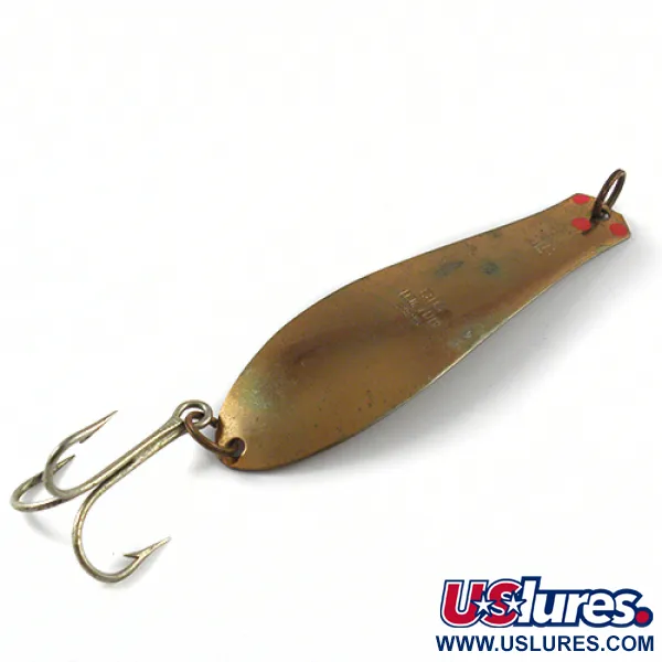 Ant žalvarinio korpuso aiškiai įspaustas pavadinimas „BIG DOCTOR 285“ identifikuoja šią tvirtą blizgę, pagamintą Viskonsino valstijoje įsikūrusios „Prescott Spinner“ kompanijos. Šis JAV pagamintas masalas, sveriantis 30 g (1 oz) ir esantis 11 cm (4 1/4") ilgio, yra sukurtas pasiekti gilesnius vandens sluoksnius tiek metant, tiek velkiaujant. Bronzos (žalvario) apdaila turi švelnią, sendintą išvaizdą, kurią pabrėžia trys ryškūs raudoni taškai šalia tvirtinimo žiedo, tarnaujantys kaip klasikiniai vizualiniai akcentai. Didelis trišakis kablys yra pritvirtintas per patvarų žiedelį apačioje, užtikrinant patikimą ryšį su stambiomis gėlavandenėmis žuvimis. Šis egzempliorius, pažymėtas prekės kodu 2903, yra 4/5 būklės, turi lengvų nusidėvėjimo žymių, tačiau išlieka visiškai funkcionalus ir tvirtas. Jo konstrukcija būdinga vidurio amžiaus patikimų amerikietiškų metalinių masalų gamybos erai, o gamintojo vieta taip pat yra iškalta ant metalinio paviršiaus.