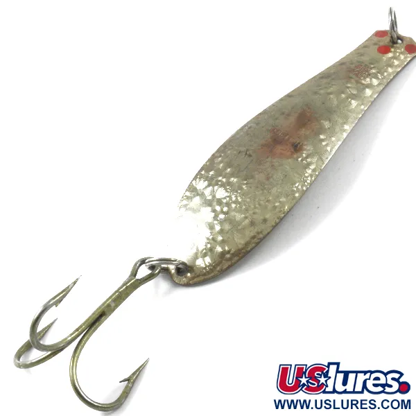 Ši 1 unciją (30 g) sverianti blizgė pasižymi reta „Crystal“ apdaila – muštu raštu, sukurtu imituoti sudužusio stiklo spindesį po vandeniu. Prescott Spinner Big Doctor 285, žymimas prekės kodu 3173, yra 4 1/4 colio (11 cm) ilgio ir išlaiko klasikinį amerikietišką profilį. Maži raudoni akcentiniai taškai prie kilpelės suteikia subtilų spalvos akcentą tekstūruotam metaliniam korpusui. Šis vintažinis modelis yra 4/5 būklės, o tai atspindi gerai išsaugotą istoriją su nedideliu paviršiaus nusidėvėjimu, atitinkančiu jo amžių. Originali furnitūra, įskaitant trišakį kabliuką ir žiedelius, išlieka tvirta ir tinkama spiningavimui ar velčiavimui.