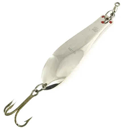 Solidus 30g (1oz) svoris iškart parodo, kad ši vartiklė puikiai tinka pasiekti giliai tūnančius plėšrūnus. 11cm (4 1/4") ilgio masalas pasižymi dviejų tonų estetika: poliruotu sidabriniu paviršiumi ir sodraus aukso spalvos nugarėle. Maži raudoni akcentai prie viršutinės kilpelės suteikia spalvinį blyksnį blizgančiam metaliniam korpusui. Sidabrinėje pusėje aiškiai išspaustas „DOCTOR“ žymėjimas, nurodantis, kad tai 7110 produkto kodo modelis. Ši JAV pagaminta vartiklė turi tvirtą trišakį kabliuką ir sklandžiai besisukantį suktuką, pritvirtintą sustiprintais žiedeliais. Masalas yra 5/5 būklės, o auksinis ir sidabrinis paviršiai išlaikę pradinį itin blizgų užbaigimą. Storas metalas pritaikytas tolimiems metimams arba trolingui gaudant dideles gėlavandenes plėšriąsias žuvis.