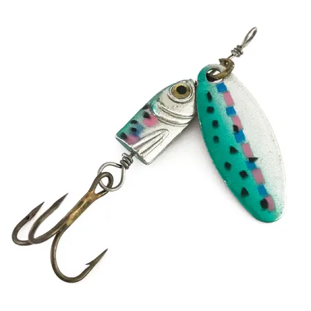Nikelio / Upėtakio spalvinė gama apibrėžia šios klasikinės sukrės, identifikuojamos prekės kodu 7888, estetiką. 5 g (3/16 oz) svorio ir 5,5 cm (2 1/4") ilgio konstrukcija pagrįsta pasunkintu žuvelės galvos formos korpusu, kuris suteikia reikiamą svorį metimams į gilesnes vandens vietas. Lašo formos lapelis priekinėje dalyje papuoštas detaliu upėtakio motyvu su žaliais, rausvais ir mėlynais akcentais sidabriškai baltame fone, o nugarinė pusė išlaiko poliruotą nikelio paviršių. Kilusi iš Suomijos su Blue Fox prekės ženklu, ši sukrė turi tradicines vielos apvijų kilpeles ir tvirtą trišakį kabliuką. Kiekviena korpuso ir lapelio detalė išlieka aiški ir gerai apibrėžta, o tai atitinka 5/5 būklės įvertinimą.