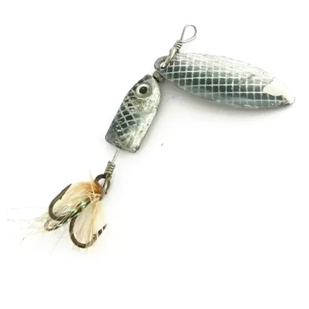 Ši Suomijoje pagaminta 5 g svorio sukrė demonstruoja meistriškumą, būdingą šio prekės ženklo suomiškoms šaknims. Blue Fox Flash Deep Runner „Rainbow Silver“ apdaila pasižymi išskirtiniu tinkliniu žvynelių raštu tiek ant lašo formos lapelio, tiek ant pasunkintos žuvelės formos galvutės, kas išskiria ją iš įprastų lygių masalų. 5,5 cm ilgio egzempliorius turi prekės kodą 8318 ir yra 4/5 būklės, išlaikęs švarų detalių spindesį. Konstrukcijoje naudojamas trišakis kablys su natūraliomis plunksnomis, sukuriančiomis minkštą profilį už švininio korpuso. Kolekcionieriai įvertins lapelio ir pasunkinto korpuso lygiavimą – tai techninis sprendimas, skirtas pasiekti tam tikrą gylį traukiant masalą. Sidabrinė danga išlieka ryški, ypač per tekstūrinius žvynelių raštus, kurie apibūdina šį konkretų spalvos variantą.