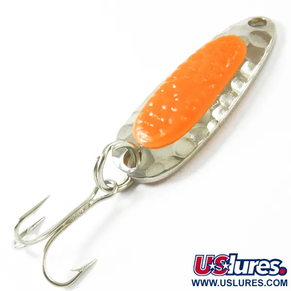 Ryškiai oranžinis lašišos ikro imitacijos įdėklas yra įmontuotas šios Blue Fox Pixee kalto nikelio korpuse, sukuriant vizualų dirgiklį, seniai pasiteisinusį lašišų ir plienagalvių upėtakių žūklėje. Šis konkretus pavyzdys, pažymėtas prekės kodu 3442, yra 3,5 cm (1 1/2") ilgio ir sveria 4,5 g (3/16 oz). Stora žalvarinė konstrukcija užtikrina reikiamą tankį tolimiems metimams pučiant pakrantės vėjams arba norint pasiekti gilias upės duobes. Kitoje pusėje metalas pažymėtas gamintojo spaudu, atspindinčiu istoriją, kai Blue Fox tęsė originalių Nebco dizainų palikimą. Kalta tekstūra skirta gaudyti šviesą keliais kampais, o oranžinis įdėklas imituoja srovėje dreifuojantį ikrą. Visa furnitūra, įskaitant žiedelį ir trišakį kabliuką, atrodo puikiai prižiūrėta, įvertinta 5/5. Konstrukcija leidžia vartyis į duobes žvejojant upėse arba išlaikyti stabilią trajektoriją traukiant sūriame vandenyje.