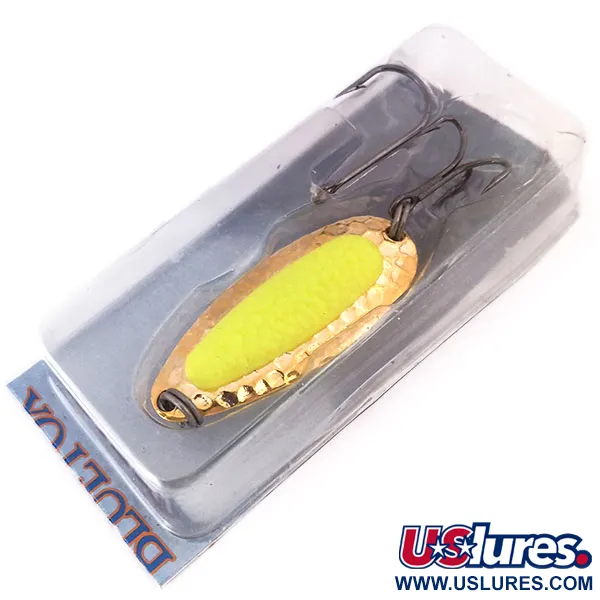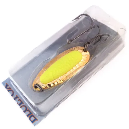 Šis 1/2oz (14g) svorio masalas turi sunkų žalvarinį korpusą, padengtą tikru 24 karatų auksu. 5,5cm ilgio konstrukcijoje naudojamas ryškiai geltonas lašišos ikrą imituojantis intarpas, kuris tarnauja kaip kibimo taškas. Masalas Blue Fox Pixee UV (kodas 10285) yra nenaudotas, išsaugotas originalioje pakuotėje. Jis subalansuotas tolimiems metimams ir stabilumui upės srovėje, kur gali vartytis arti dugno. UV šviesoje arba tamsoje intarpas skleidžia stiprų žalią švytėjimą, užtikrinantį puikų matomumą giliame ar drumstame vandenyje. Šis egzempliorius įvertintas 5/5 balais, be jokių naudojimo žymių ant auksuoto paviršiaus.