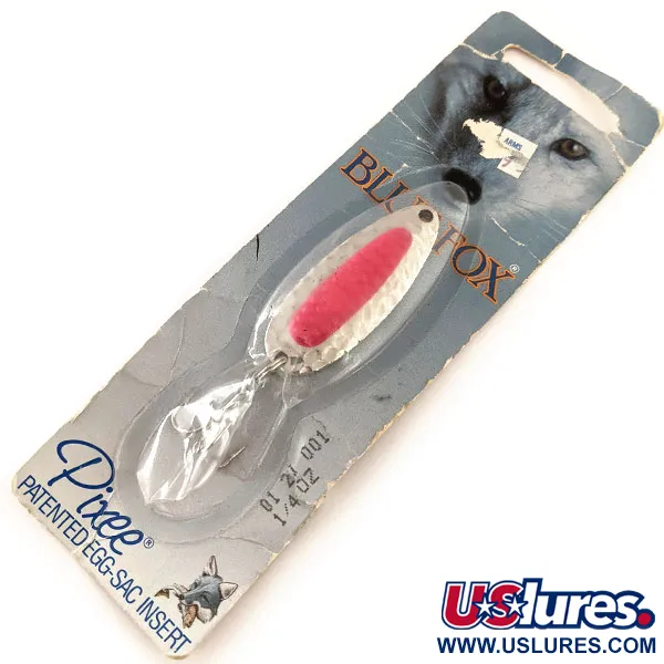 Ryškiai rožinis fluorescencinis ikrų maišelio įdėklas yra pačiame kalto nikelio plokštelės centre – tai pagrindinis šio masalo vizualinis akcentas. Gaminio kodas 11858, blizgės ilgis 4,5 cm (1 3/4"), o svoris 7 g (1/4 oz), todėl ji puikiai tinka tolimiems metimams net ir pučiant priešiniam pajūrio vėjui. Sunki žalvarinė konstrukcija sukurta atlaikyti korozinę druskingo vandens aplinką ir stiprias upių sroves. Ši Blue Fox Pixee yra nenaudota, originalioje 1984 m. pakuotėje iš Kembridžo (Minesota) eros. UV spinduliams jautrios savybės ir kalta tekstūra sukurti užtikrinti gerą matomumą bei atspindžius tiek spiningaujant, tiek velkiaujant. Žvejai šį modelį dažniausiai naudoja gaudydami plienagalvius upėtakius, lašišas ir lydekas, išnaudodami masalo galimybę dirbti tiek giliai, tiek sekliai. Pakuotės nugarėlėje pateikiamos techninės instrukcijos, aprašančios specialias lake pumping ir river tumbling technikas. Masalo būklė įvertinta 6 balais, nes furnitūra yra gamyklinės būklės ir niekada nebuvo vandenyje.