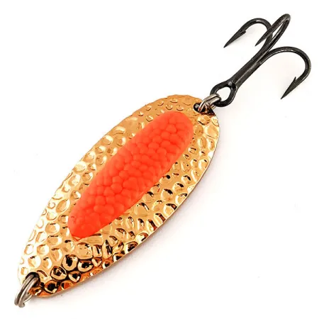 Sunki 24 g (3/4 oz) žalvarinė konstrukcija apibūdina šią Blue Fox Pixee UV blizgę, sukurtą tolimiems metimams, reikalingiems upėse ir priekrantės zonose. 6,5 cm (2 1/2") ilgio modelio mušta Gold / Pink apdaila sukuria įvairiapusį spindesį vandenyje. Pagrindinis šio modelio akcentas – lašišos ikro imitacijos detalė; natūralioje šviesoje ji atrodo ryškiai oranžinė-rožinė, tačiau UV spindulių spektre ji skleidžia specifinį švytėjimą, padedantį žvejojant prasto matomumo sąlygomis. Šis konkretus egzempliorius, pažymėtas produkto kodu 12187, pasižymi storu korpusu, kuris leidžia blizgei vartytis ir ridentis giliose duobėse per greitai neiškylant į paviršių traukimo metu. Komplektacijoje yra tamsintos apdailos trišakis kablys ir tvirti žiedeliai, būdingi JAV gamybos tradicijoms. 5/5 būklės blizgės metalinė danga ir speciali detalė išlieka ryškios, todėl tai patikimas pasirinkimas gaudant plienagalvius upėtakius, lašišas ar lydekas.