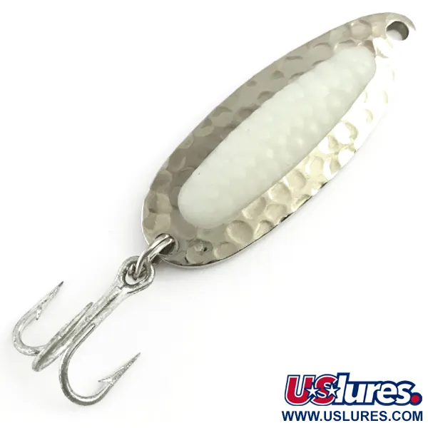 Ant šio 7 g (1/4 uncijos) sunkaus žalvario korpuso nugarėlės aiškiai išspaustos „Blue Fox“ žymės, identifikuojančios jį kaip klasikinį „Pixee“ dizainą. Blizgės priekinė dalis pasižymi gilios tekstūros kalto nikelio apdaila, užtikrinančia stiprų blyksėjimą, o centre yra lygus, baltas UV liuminescencinis įdėklas, imituojantis lašišos ikrų kekę. 4,5 cm (1 3/4") ilgio šis egzempliorius (produkto kodas: 5815) yra 5/5 būklės, išlaikęs ryškų atspindintį paviršių ir aštrų trišakį kabliuką. Plokščioje poliruotoje galinėje plokštelėje įspausta „PIXEE PAT.“ ir svorio žyma. Skirta tolimiems metimams tiek gėlame, tiek sūriame vandenyje, blizgės tankis leidžia jai efektyviai vartytis ir suktis upės srovėse ar gilesnėse ežerų zonose. Fluorescuojanti balta šerdis skirta išlikti matoma plėšriosioms žuvims prasto apšvietimo sąlygomis arba gylyje, kur prasiskverbia UV šviesa.