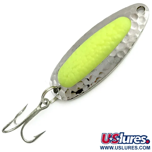 Kalto nikelio žvyneliai atspindi šviesą ant masyvaus žalvarinio šios 14 g (1/2 oz) blizgės korpuso. Ši 5,5 cm (2 1/4") ilgio Blue Fox Pixee UV, kurios produkto kodas 5877, pasižymi išskirtiniu geltonu lašišos ikro imitacijos įdėklu, skirtu išprovokuoti puolimą. Šis konkretus pavyzdys yra 5/5 būklės, su aiškiu gamykliniu spaudu "Blue Fox PIXEE PAT.", svorio nuoroda bei prekės ženklo logotipu ant poliruotos nugarėlės. Geltonas įdėklas yra fluorescencinis ir aktyvus UV spinduliuose, todėl yra matomas gilesniame vandenyje ar prasto apšvietimo sąlygomis. Blizgė sukurta tolimiems metimams net pučiant pajūrio vėjams, turi tvirtą žiedelį ir aštrų trišakį kabliuką. Didelis tankis leidžia efektyviai žvejoti stipriose upių srovėse gaudant lašišas ar plienagalvius upėtakius, nes masalas sukurtas vartytis ir ridentis per gilias duobes.