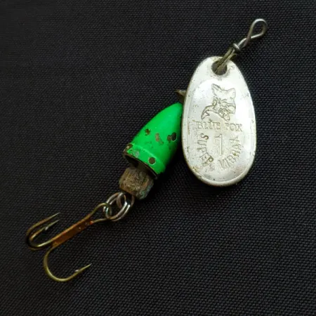 Ant šios 1 dydžio sukriukės sidabrinio lapelio aiškiai iškaltas ikoniškas lapės logotipas, o kitoje pusėje esantis užrašas „Made in Finland“ pabrėžia jos kilmę. Sverianti 4 g (1/8 oz), ši Blue Fox Super Vibrax 1 pasižymi klasikine dviejų dalių varpelio formos korpuso konstrukcija. Žaliai dažytas vidinis elementas turi natūralaus nusidėvėjimo žymių, todėl masalo būklė vertinama 4/5, kartu išlaikant vintažinį žavesį. Identifikuojamas pagal prekės kodą 18815, masalas turi tvirtą trišakį kabliuką ir žalvario spalvos tarpiklius ant vielinės ašies. Iškaltas tekstas ant lapelio paviršiaus yra ryškus, aiškiai matomas prekės ženklas ir dydžio žymėjimas. Ant žalios varpelio dalies matomos nedidelės dėmės, kur bėgant metams dažai nusitrynė, atidengdami metalinį pagrindą.