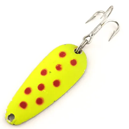 Ši JAV pagaminta blizgė, padengta ryškiais šartrezo spalvos dažais su ryškiais raudonais taškais, yra skirta geram matomumui esant skirtingam vandens skaidrumui. Nenaudotos būklės (įvertinimas 6), apdaila išlieka vientisa ir atspindinti šviesą per visą 5 cm (2 colių) profilį. Nors fluorescencinis šartrezas išsiskiria dienos šviesoje, ypatingas Blue Fox Tor-P-Do UV naudingumas atsiranda dėl jo reaktyvios dangos, kuri intensyviai švyti UV šviesoje, todėl raudoni taškai atrodo kaip tamsūs, didelio kontrasto puolimo taškai. Tvirtas trišakis kablys patikimu žiedeliu pritvirtintas prie poliruotos nikeliuotos apatinės dalies, o bendras svoris yra 14 g (1/2 oz), kas leidžia efektyviai užmesti arba džigauti vertikaliai. Šis masalas, kurio prekės kodas 12796, dėl savo lašo formos ir pasunkinto korpuso išlaiko stabilumą velkiaujant gylyje.