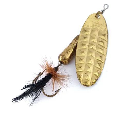 Auksiniame lapelyje įspaustas aiškus „WHISPER“ prekės ženklas kartu su 3 dydžio žyma. Ši Blue Fox Whisper 3 sukrė, identifikuojama pagal prekės kodą 10404, pasižymi deimantiniu, įspaustu raštu ant ovalaus lapelio, skirto atspindėti šviesą įvairiais kampais. Bendras masalo ilgis yra 7 cm (2 3/4 colio), jis sveria 11,5 g (2/5 uncijos), o tai suteikia pakankamai svorio tiksliems metimams įvairiomis sąlygomis. Po masyvaus žalvarinio korpuso eina trišakis kabliukas, papuoštas gelsvų plunksnų ir juodų plunksnų deriniu. Matomos lengvos paviršiaus žymės ir nedidelė metalinių dalių oksidacija rodo 4/5 būklės įvertinimą. Blue Fox šią JAV pagamintą sukrę sukūrė su subalansuotu svorio paskirstymu, užtikrinančiu stabilumą tiek traukiant ramiuose ežeruose, tiek vidutinėje upės srovėje.