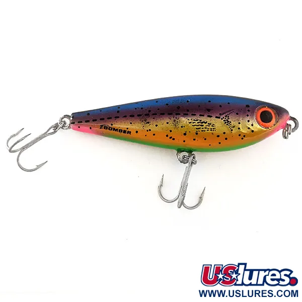 Klasikine Rainbow Trout palete pasižymintis masalas išsiskiria ryškiu purpuriniu-mėlynu nugaros perėjimu, kuris įsilieja į auksinį-geltoną šoną, nusėtą smulkiomis juodomis dėmelėmis. Sveriantis 1/2 oz (14 g) ir 3 1/2" (9 cm) ilgio, jis sukurtas tolimiems metimams gaudant lydekas ar ešerius paviršiuje. „Low Pitch“ žymėjimas nurodo vidinę akustiką, sukuriančią žemą garsą, siūlantį kitokį garso profilį nei tradiciniai aukšto dažnio tarškantys masalai. Ryški oranžiniu apvadu akis sukuria didelio kontrasto fokusavimo tašką metalinės tekstūros galvoje. Turintis prekės kodą 11384, masalas šone pažymėtas Bomber pavadinimu ir išlaikęs originalią furnitūrą. Puikios 5/5 būklės dažai išlieka blizgūs, o trišakiai kabliukai yra švarūs, o tai rodo patvarią šio JAV pagaminto masalo konstrukciją. Subtilus rožinis akcentas išilgai pilvo užbaigia tikrovišką upėtakio imitacijos profilį.