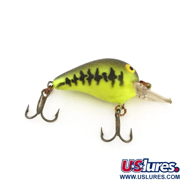 Šis itin lengvas vobleris (1/16 oz, 2 g), sustojęs plūduriuojantis vandens paviršiuje, yra preciziškas įrankis lengvosios žūklės mėgėjams. Šis konkretus Bomber Fat A B03F modelis, kurio produkto kodas 7859, pasižymi CBB Baby Bass spalvinimo gama. Vizualinis profilis susideda iš ryškaus geltonai salotinio (chartreuse) pagrindo su tamsiomis dėmėtomis žymėmis, imituojančiomis jauno ešerio siluetą. UV šviesoje danga pasižymi ryškiu švytėjimu, kuris užtikrina matomumą drumstame vandenyje arba žvejojant prasto apšvietimo sąlygomis. 1 1/4" (3 cm) ilgio korpusas sukomplektuotas su skaidriu liežuvėliu, skirtu panardinti masalą į 1,2–1,8 m (3,9–5,9 pėdų) gylį. Šis sekliai nardantis modelis turi du bronzuotus trišakius kabliukus ir yra įvertintas 5/5 dėl puikios būklės – dažai ir furnitūra puikiai išlaikyti. Jis skirtas spiningavimo technikai, orientuojantis į tokias rūšis kaip ešerys ir šapalas.