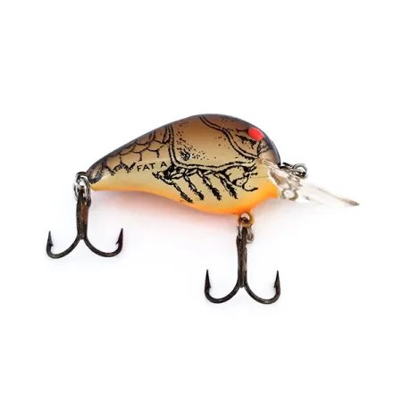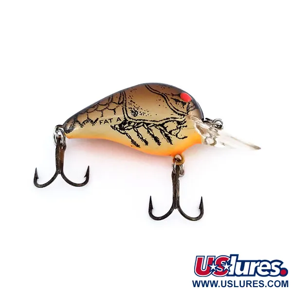 Šis kompaktiškas, ultralengvas masalas, papuoštas CBB spalvinimo raštu, pasižymi rusvu kūnu su tamsia vėžio kiauto grafika ir ryškiai oranžiniu pilveliu. 3 cm (1 1/4") ilgio ir 2 g (1/16 oz) svorio vobleris yra specializuotas įrankis ešerių ir šapalų žūklei. Skaidrus liežuvėlis suprojektuotas pasiekti nuo 1,2 m (3,9 ft) iki 1,8 m (5,9 ft) gylį standartinio spiningavimo metu. Šis JAV pagamintas egzempliorius, pažymėtas produkto kodu 9961, turi aiškiai ant šono išspaustą modelio pavadinimą „FAT A“. Du tamsintos apdailos trišakiai kabliukai pritvirtinti tvirtais žiedeliais, o tai atitinka nepriekaištingą masalo būklę. Ryškiai raudonos akys yra tiesiai virš liežuvėlio, sudarydamos ryškų akcentą tamsiai rudo gradiento fone ant galvos ir nugaros.