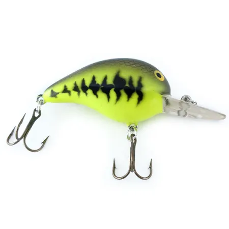 Baby Bass apdaila ant šio 5 cm (2") masalo suteikia ryškų, didelio kontrasto profilį, kuris puikiai matomas įvairiomis vandens sąlygomis. Šis Bomber Fat A B05F, pažymėtas produkto kodu 11084, yra klasikinio dizaino, JAV pagamintas plaukiantis vobleris (crankbait), sveriantis 10 g (1/3 oz). Konstrukcija pasižymi tvirtu, integruotu skaidriu liežuvėliu, skirtu panardinti masalą į 1,8–2,4 m (6–8 ft) darbinį gylį, todėl tai patikimas pasirinkimas žvejojant ešerius ar šapalus. Masalo būklė yra nepriekaištinga (5/5), originalūs dažai ir furnitūra išlaikyti puikiai. Spalvinis raštas pereina nuo tamsiai alyvinės nugaros iki ryškių šartrezo (chartreuse) šonų, akcentuotų firminiu tamsių dėmių raštu šonuose. Du aštrūs trišakiai kabliukai prie pilvelio ir uodegos pritvirtinti standartiniais žiedeliais. Padidintos geltonos akys yra šios serijos vizitinė kortelė, suteikianti aiškų akcentą priekinėje kūno dalyje.