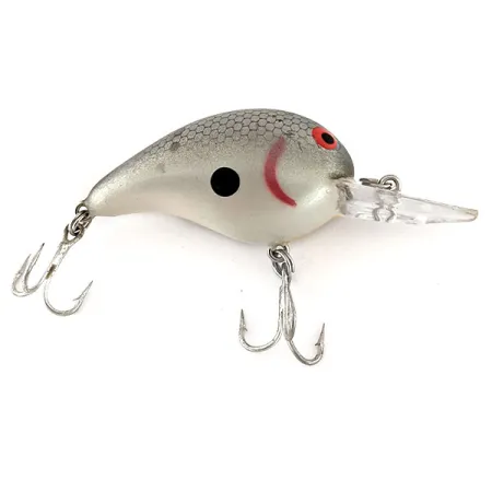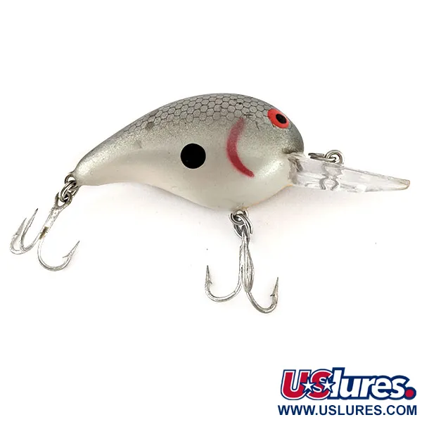 Išskirtinis sidabrinis šešiakampis žvynų raštas dengia šio 1/3 uncijos (10 g) voblerio viršutinę nugaros dalį, suteikdamas tekstūrinę išvaizdą lygiems pilkai baltiems šonams. Šis JAV pagamintas Bomber Fat A B05F, atpažįstamas pagal prekės kodą 12427, turi ryškią juodą šoninę dėmę ir išlenktą raudoną žiaunų brūkšnį už didelių raudonų akių su juodais vyzdžiais. 2 colių (5 cm) ilgio plaukiantis korpusas turi skaidrų, suapvalintą liežuvėlį, pritaikytą 1,8–2,4 m (6–8 pėdų) darbiniam gyliui. Konstrukciją sudaro du originalūs sidabrinės spalvos trišakiai kabliukai, todėl tai yra klasikinis pasirinkimas žvejojant ešerius ar šapalus. 5/5 būklės masalas neturi jokių naudojimo žymių, išlaikydamas blizgią apdailą visame profilyje.