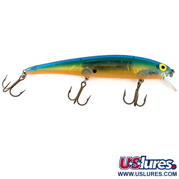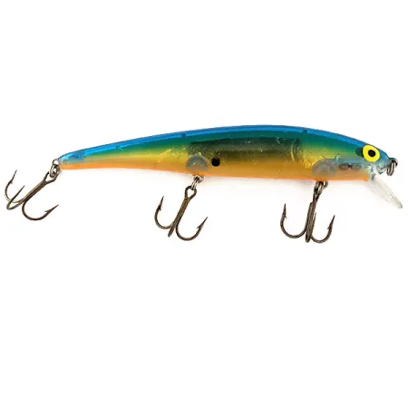 Auksiniai ir oranžiniai šonai, pereinantys į tamsiai mėlyną nugarą, apibūdina klasikinį XBBO spalvinį raštą šio JAV pagaminto voblerio. 12 cm (4 3/4") ilgio ir 12 g (2/5 oz) svorio Bomber Long A pavyzdys pasižymi lieknu profiliu, kuris tapo standartu standartu starkių ir lydekų žvejams. Šis konkretus 11375 modelis yra „suspender“ tipo (neutralaus plūdrumo), sukurtas pakibti vandens storymėje 0,6 - 0,9 m (2-3 ft) gylyje spiningaujant arba 1,2 - 2,4 m (4-8 ft) gylyje velkiaujant. Permatomame korpuse matomos vidinės barškučių kameros, kurios traukimo metu suteikia specifinį akustinį profilį. Trys aštrūs trišakiai kabliukai pritvirtinti tvirtais žiedeliais, atspindinčiais patvarią konstrukciją, būdingą Bombers JAV gamybos erai. Geltonos akys su dideliais juodais vyzdžiais sukuria didelio kontrasto tašką žėrinčių auksinių šonų fone. Šis pavyzdys yra 5/5 būklės, išlaikęs originalią gamyklinę apdailą ir skaidrias plastikines detales.